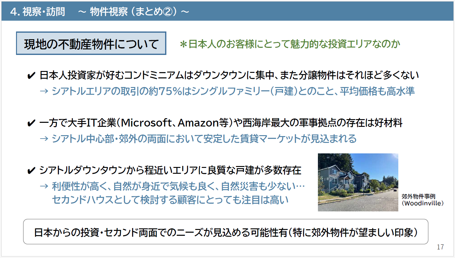 (2) 今後の弊社の事業展開先としてシアトルを検討することはできるか(日本人のお客様にとって魅力的な投資エリアなのか)を初期的に確認する