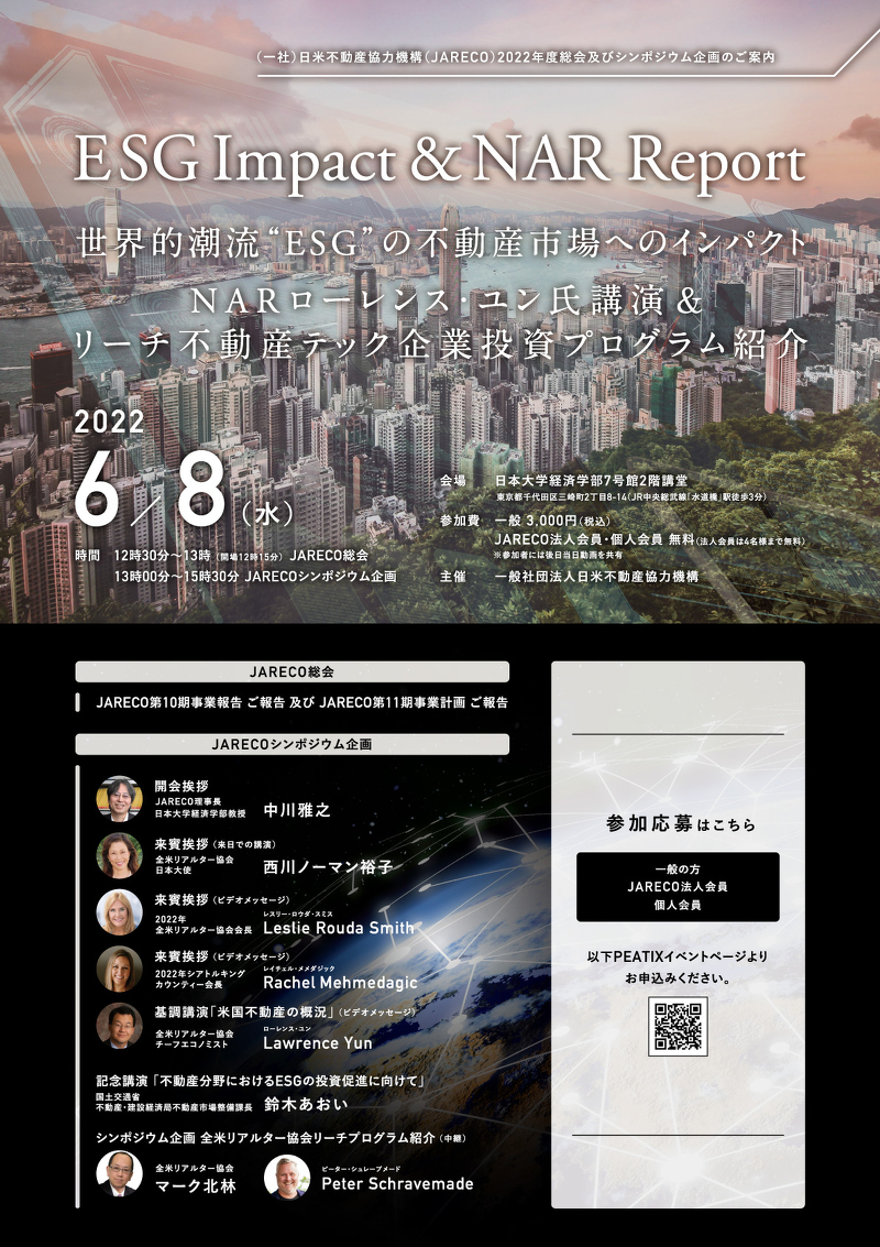 (一社)日米不動産協力機構(JARECO)では2019年以来のリアル開催による総会及びシンポジウム企画を開催いたします。今回は、恒例の全米リアルター協会チーフエコノミストのローレンス・ユン氏によるアメリカの米国不動産の市況に関する講演、メインテーマとして世界的に進むESG投資の不動産に与える影響に関して、さらに全米リアルター協会による不動産テック企業への投資プログラムの解説、最後に今年度よりスタートする「シアトルホームスティプログラム」のご紹介等、充実したプログラムでの開催となります。ぜひ皆様のご参加をお待ちしております。