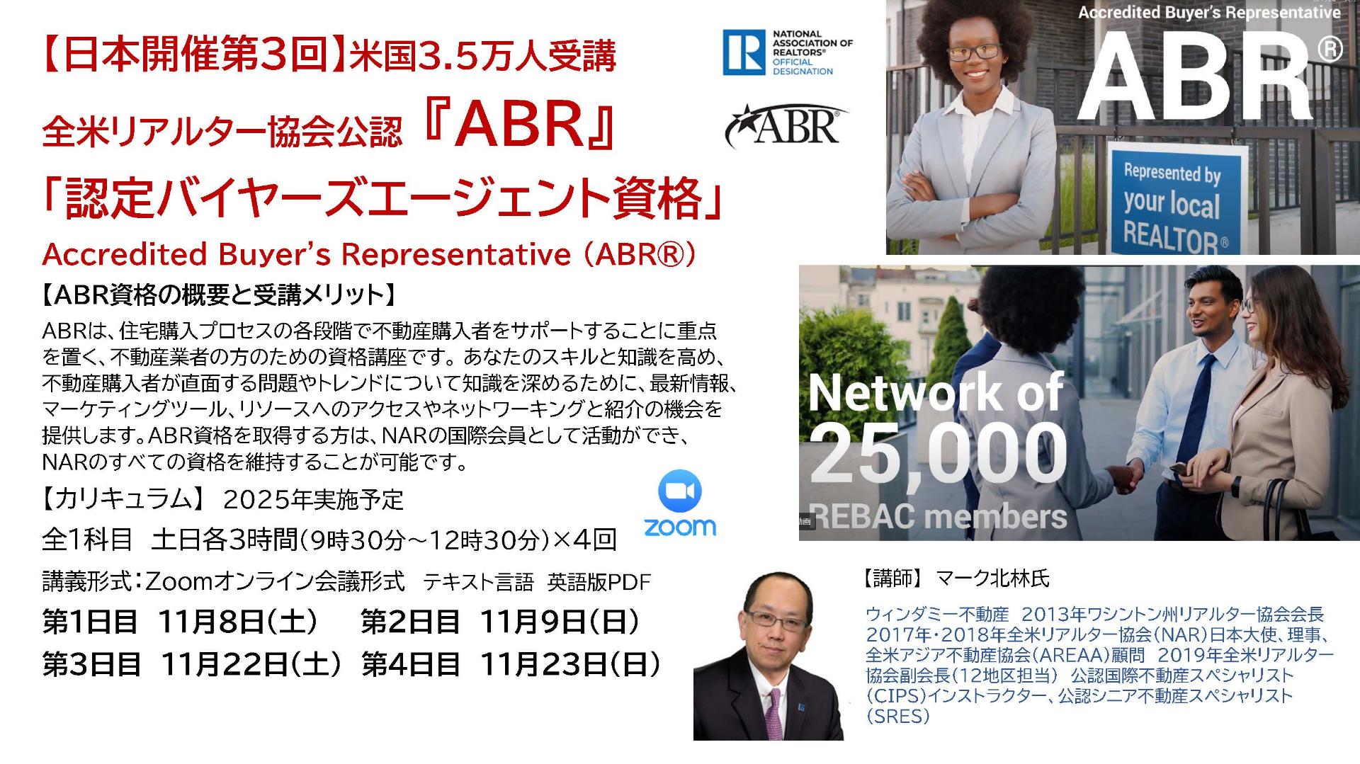 この度、日本開催第3期となる全米リアルター協会公認ABR「認定バイヤーズエージェント資格」Accredited Buyer's Representative (ABR®) が、