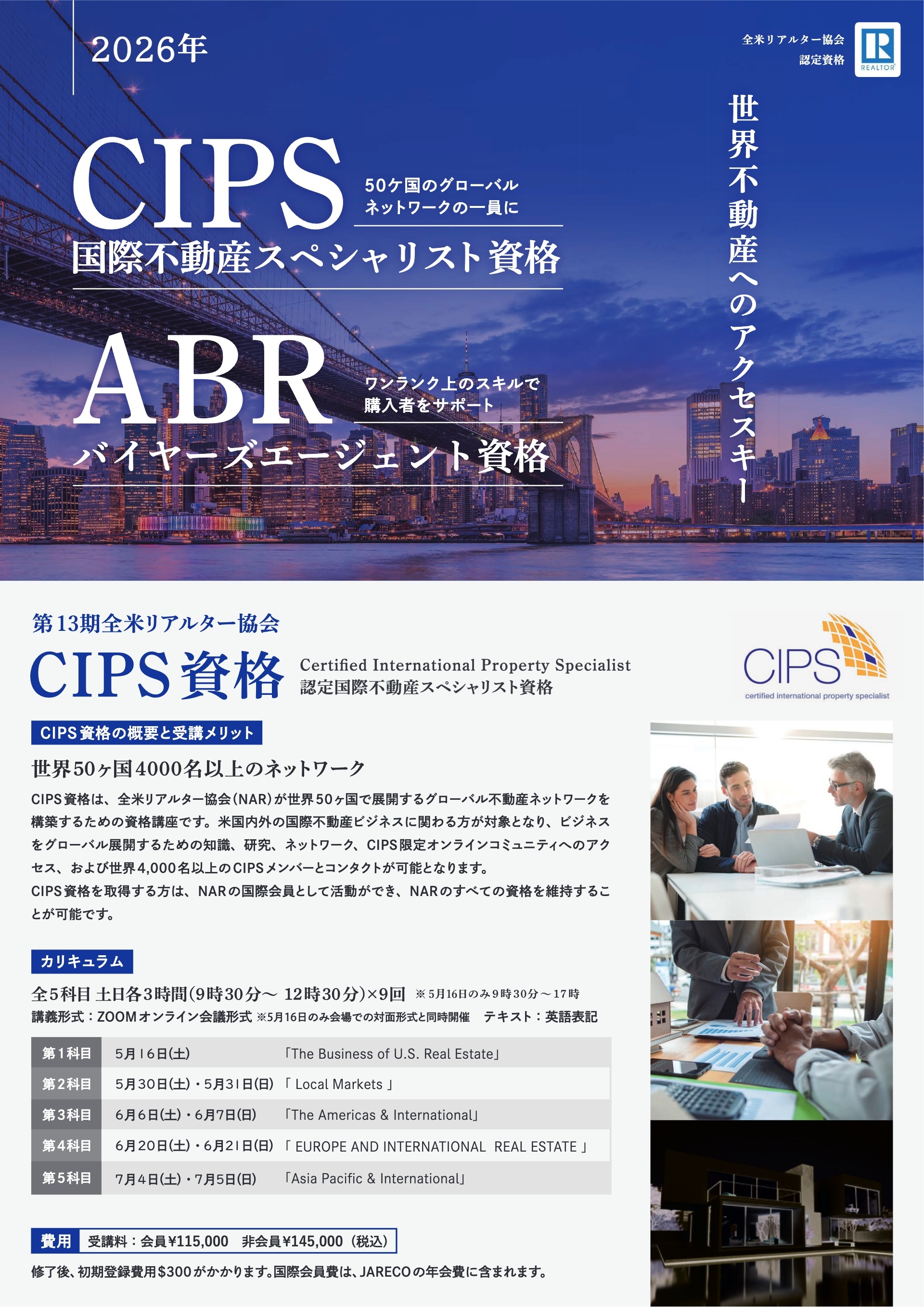 CIPS資格は、全米リアルター協会(NAR)が世界50ヶ国で展開するグローバル不動産ネットワークを構築するための資格講座です。